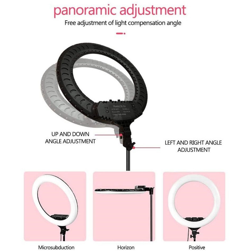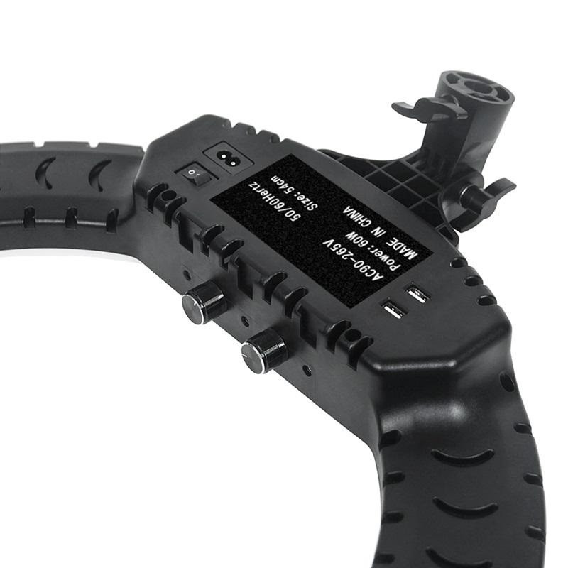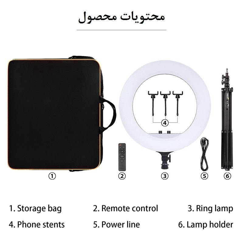ویژگی ها: طول پایه:210سانتی متر قدرت خروجی: 55W نوع نور: LED CRI: بیشتر از 90 محدوده قدرت: 10% تا 100% ولتاژ ورودی: 220V قطر بیرونی: 45 سانتی متر پورت USB: دارد(2پورت) اقلام داخل محصول: رینگ لایت -سه پایه -کیف برزنتی-.ریموت کنترل .3 عدد نگهدارنده موبایل -کابل برق .