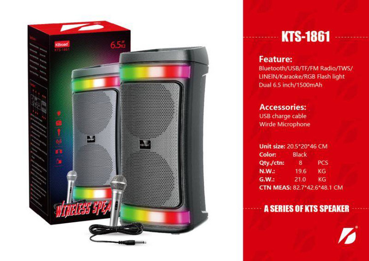 اسپیکر دبل 6.5 اینچ برند معتبر مدل kts 1861 *آکبند و پلم* کیفیت فوق العاده سایز دبل 6.5 اینچ توان خروجی 40وات فضای پوشش دهی 100متر ارتفاع 46 سانتی متر برد بلوتوث 10 متر قدرت 2300 وات امکانات: بلوتوث فلش مموری رادیو ای یو ایکس رقص نور جذاب و حساس به صدا قابلیت ویژه TWS(جفت سازی با یکدیگر) باتری قوی3500میلی آمپری و نگهداری شارژ به مدت4ساعت، با پاور بانک (24 الی 48 ساعت)پخش مداوم قابلیت شارژ با شارژر موبایل/شارژر فندکی/پاور بانک